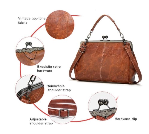 - Elegantní design s černým titanovým rámem v vintage stylu, zapínání na magnetický patent, klasický retro vzhled, ležérní styl. Lze nosit jako kabelku s uchy, přes rameno, jako crossbody, jako messenger bag nebo jako tašku typu tote.