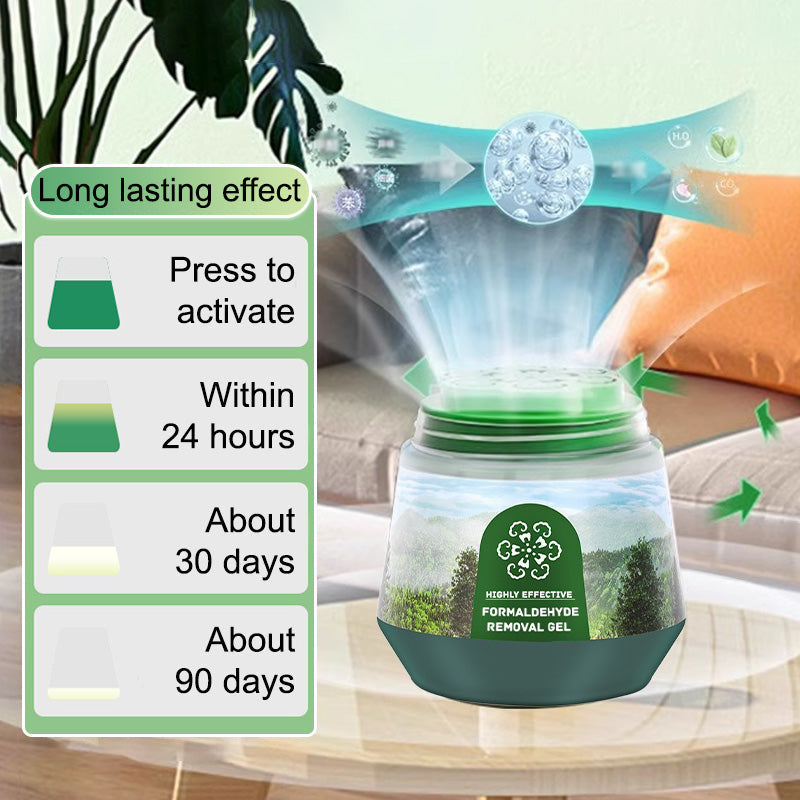 DLOUHODOBÝ ÚČINEK - 24hodinová míra odstranění formaldehydu může dosáhnout 99% účinku. Vysoce účinný gel na odstraňování formaldehydu nabízí dlouhodobou ochranu proti škodlivinám v ovzduší v interiéru. Po otevření a použití dokáže jediná plechovka tohoto gelu účinně vyčistit vzduch v prostoru o rozloze až 15 metrů čtverečních.