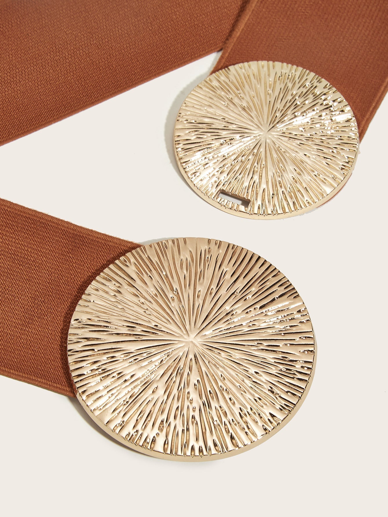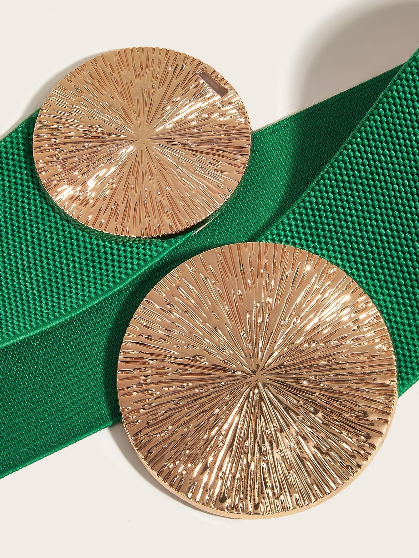 Délka opasku: 70 cm Materiál přezky opasku: slitina Typ zapínání: háček Šířka: široký styl (>4 cm) Detaily designu: dvojitá kulatá přezka s elastickým nastavením