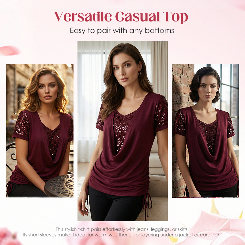 ZÁŘIVÝ DESIGN S FLITRY – Okamžitě pozvedne váš vzhled díky třpytivým flitrovým panelům na hrudi a rukávech. Tento poutavý detail dodává nádech glamouru, díky čemuž je tričko ideální na večírky, dovolené a speciální večerní akce.