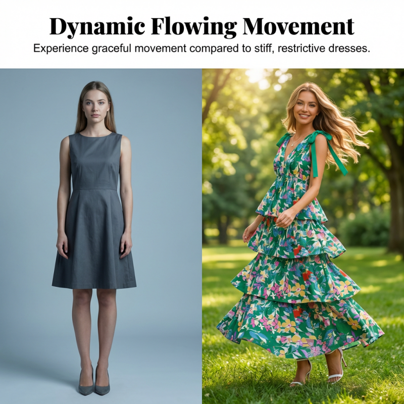 DYNAMICKÝ POHYB – Na rozdíl od tuhých oděvů, které omezují váš krok, náš vrstvený volánkový design krásně zachycuje vánek a vytváří dynamický, plynulý pohyb, který přitahuje pozornost všude kolem.