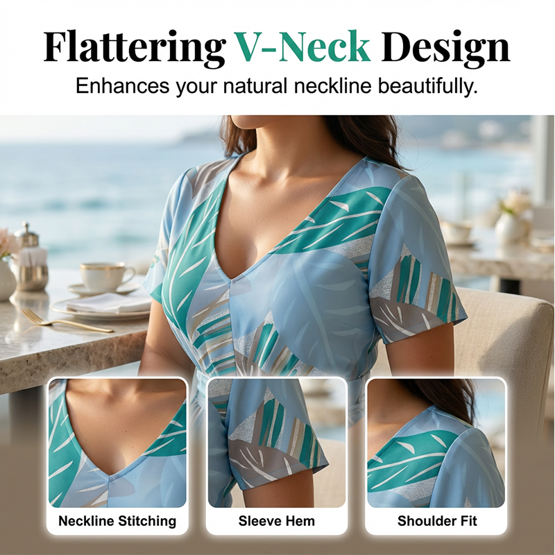 LICHOTIVÝ VÝSTŘIH DO V - Pečlivě zpracovaný výstřih do V krásně zvýrazňuje váš přirozený dekolt a nabízí sofistikovaný a univerzálně lichotivý vzhled, který pozvedne váš každodenní letní styl.